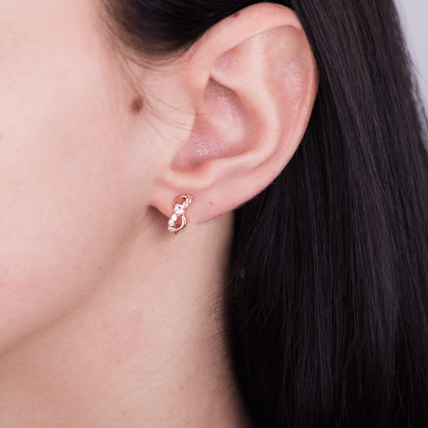 Знак бесконечности считается символом вечности и безграничной любви. Также он символизирует отсутствие любых границ как во Вселенной, так и в человеческих возможностях. С большой радостью мы спешим представить Вашему вниманию изысканные золотые детские сережки с фианитами, исполнены в форме восьмерки. Они изготовлены с красного золота 585 пробы, застегиваются на английский замочек и невероятно красиво выглядят в ушках. Центром восьмерки является большой белый фианит, который закреплен с помощью четырех крапанов. Благодаря этому способу закрепления вставки камушек можно разглядеть со всех сторон, он притягивает взоры своим сиянием и блеском. По три камушка, меньших размеров, украшают стороны восьмерки в двух направлениях от центрального фианита. Благодаря вставкам и сиянию драгоценного металла серьги привлекают внимание своим сказочным мерцанием. По нашему мнению, золотые серьги в виде знака бесконечности станут отличным подарком для юной девочки.