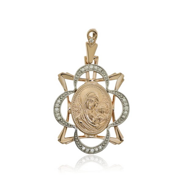 Золотая ладанка с изображением Богородицы изготовлена из качественного золота 585 пробы. Драгоценный металл представлен в двух цветах: красном и белом. Дизайн украшения – это гармоничное сочетание божественного образа и роскоши полудрагоценных камней фианитов. Белые фианиты – то, что придает этому изделию особый блеск и презентабельность.