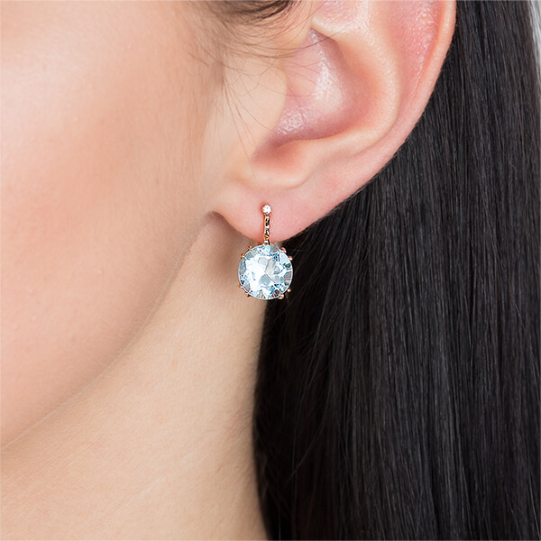 Данные изумительные серьги выполнены из красного золота 585 пробы. Лицевая сторона этих сережек дополнена круглым камнем голубым топазом. Так что любая девушка будет несказанно рада подарку в виде ювелирного украшения с этим прекрасным загадочным камнем. Кроме того, верхняя часть сережек, украшена маленьким сверкающим камешком фианитом, который будет привлекать к себе внимание в вечернее время суток, отражая искусственный свет всеми своими гранями. Застегиваются серьги английским типом замка, который обеспечивает их надежную фиксацию на ушке своей хозяйки.