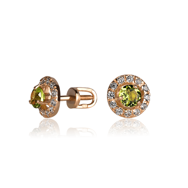 Милые и аккуратные серьги – гвоздики, ищут свою маленькую или взрослую хозяйку. Они отличаются универсальностью, сдержанностью, присущей классическому стилю. Изделия станут идеальным украшением как на вечернем приеме, так и в повседневной жизни. Сережки выполнены из красного золота 585 пробы, украшены драгоценным камнем хризолитом, и россыпью сверкающих фианитов.