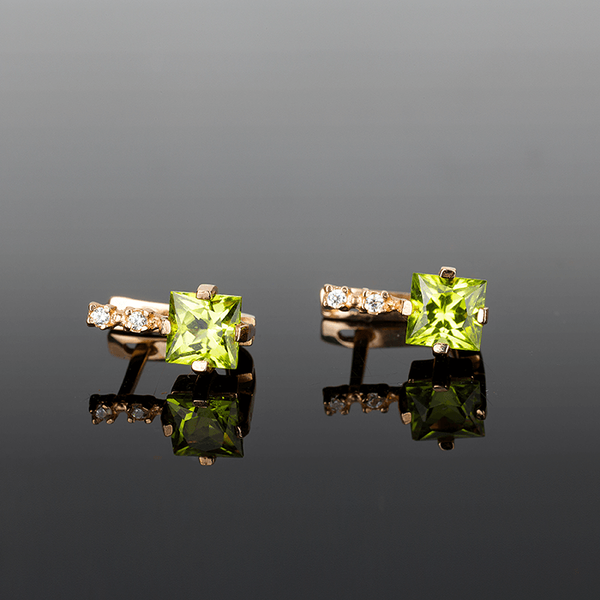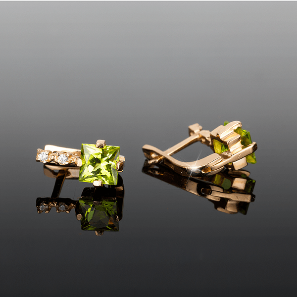 Невероятно привлекательные серьги на комфортном английском замке изготовлены из высококачественного золота 585 пробы в красном цвете металла. Изюминкой данного ювелирного украшения являются вставки из драгоценного камня – хризолита. Зеленый квадратный хризолит в золотой окантовке выглядит стильно и ярко. Такие серьги особенно красиво будут смотреться на девушках с зеленым оттенком глаз.