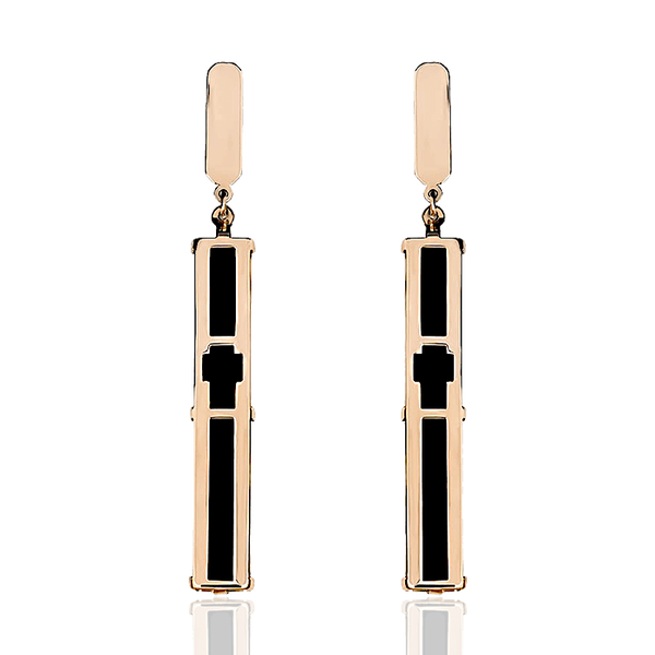 Изделие в красном золоте 585 пробы приобрело ультрамодный вид. Вставки из черного каучука оттеняют мерцание металла, удлиненные подвески подойдут для высоких причесок. Английский замок надежно крепит серьги на мочке уха. Чудесное приобретении для молодой женщины, желающей подчеркнуть индивидуальность.