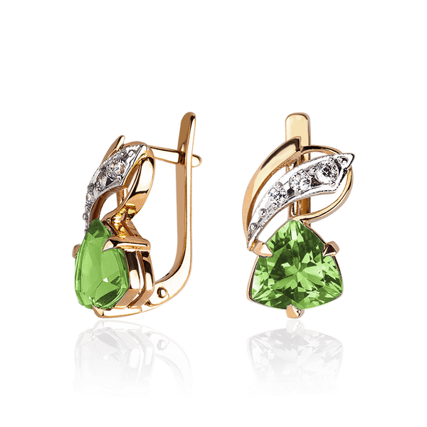 Представленные роскошные серьги изготовлены из красного золота 585 пробы и декорированы яркими вставками. Основа сережек выполнена в виде завитка с россыпью фианитов, на контрасте с которым вставка из зеленого хризолита выглядит гармонично и привлекательно. Ювелирное украшение идеально подходит девушкам со светлыми глазами, яркий зеленый камень в серьгах делает женский взгляд более выразительным и завораживающим.