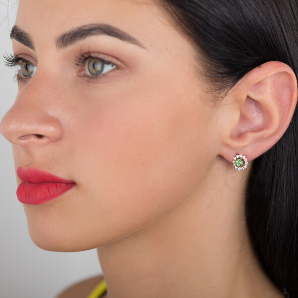 Сверкающие серьги изготовлены из качественного золота 585 пробы. Красный цвет сплава позволяет вставкам из самоцветов раскрыться наиболее полно и неповторимо. Круглый зеленый хризолит находится в центре, его окружают небольшие белые фианиты. У сережек английский замок, что делает их надежными и удобными. Они подойдут и к вечернему платью, и к романтичному женскому образу.