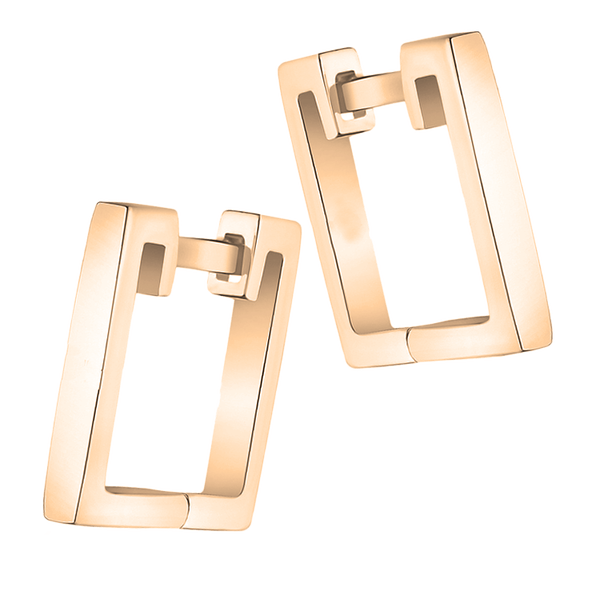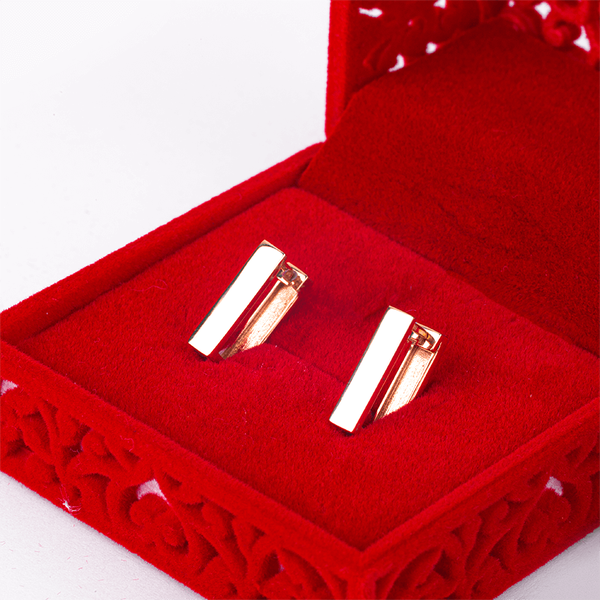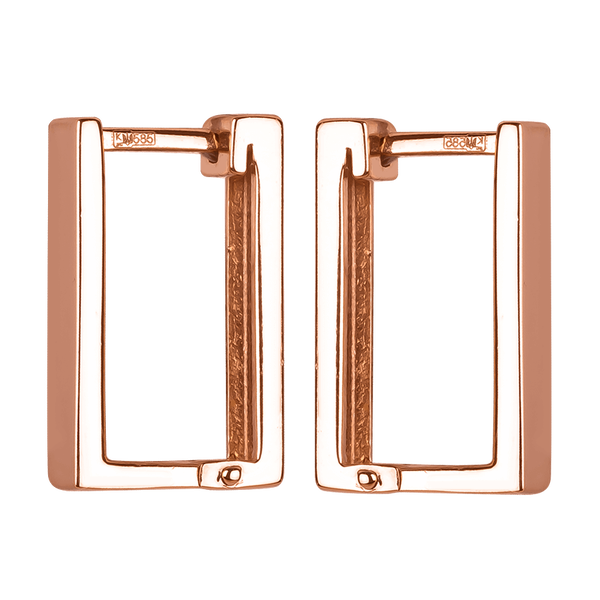 Металлический сплав, использованный в этих украшениях, имеет красный цвет, один из самых удачных вариантов как для светлой, так и загорелой кожи. Серьги из золота без вставок наделены прямоугольной формой, их поверхность гладкая и без дополнительной обработки, способна продемонстрировать сияние, присущее качественному золоту. Английский замок в качестве застежки, с легкостью удерживает серьги, позволяя одевать их без лишних усилий.