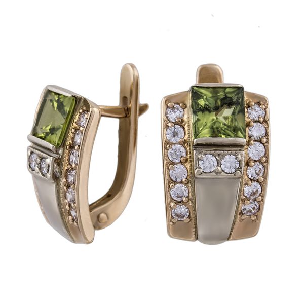 Главный камень этих сережек - хризолит. Благодаря свойствам этого камня серьги формируют гармонию вокруг их владелицы, а также привлекают удачу и любовь в её жизнь. Мелкие камешки кубического циркония добавляют серьгам ещё больше женственности и блеска.