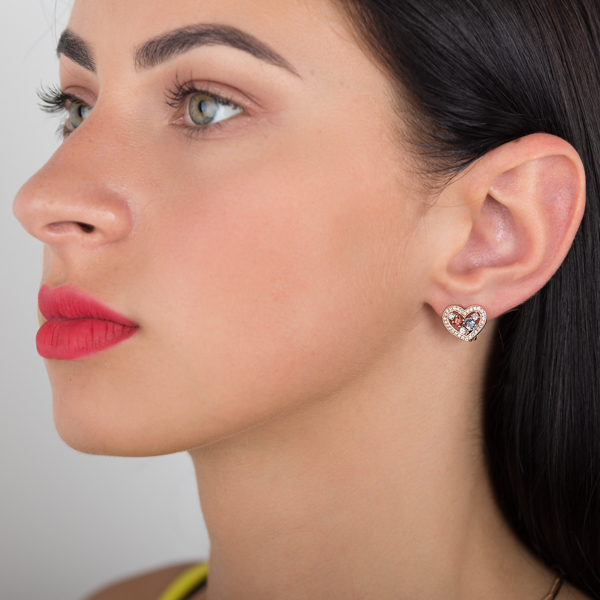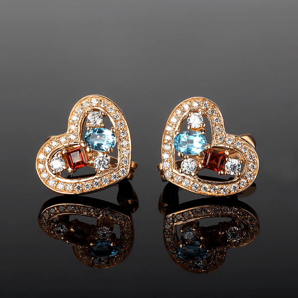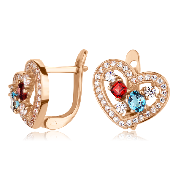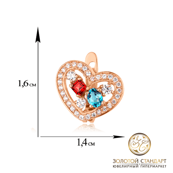 Эти серьги предназначены для тех дам, которые умеют завоевывать любовь мужчин. Они нежные и женственные, они уверены в себе и отчаянно кокетничают с мужчинами. Подарите это ювелирное украшение той девушке, что завладела Вашим сердцем, и она поймет всю серьезность вашего трепетного отношения к ней. Выполнены серьги из красного золота 585 пробы, оформлены в виде сердца, украшенного натуральным голубым топазом и сверкающими камнями циркония (фианита). Фиксируются сережки английским типом замка.