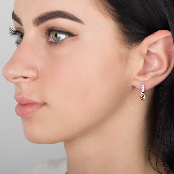 Эти стильные золотые серьги с цирконием, которые вы имеете возможность видеть перед собой на фото нашего сайта, выполнены ювелирами из красного золота 585 пробы. Мерцающие камни цирконием расположены на лицевой стороне в верхней части. Надо сказать, что внешняя часть имеет оригинальную форму. Что касается фиксации этого прекрасного ювелирного изделия, то оно застегивается на английский тип замка. Подарите это украшение девушке, которая вам нравиться, и пригласите в ресторан на ужин. Положительное отношение этой дамы вам гарантировано. И кто знает – может она ответит вам взаимностью на ваши чувства!
