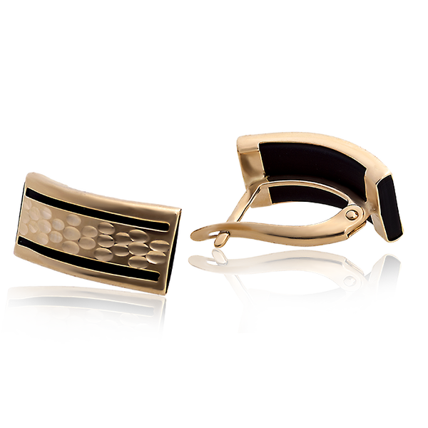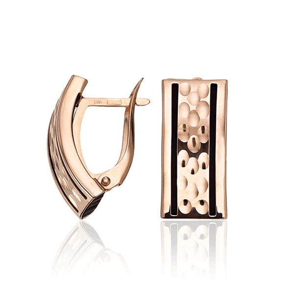 Данные золотые серьги весьма практичны и прекрасно дополнят деловой костюм уверенной в себе женщины, которая знает чего хочет от жизни. Изделие, которое мы вам охотно предлагаем на нашем сайте, выполнено из красного золота 585 пробы. Данные серьги дополнены вставкой с каучуком. Эти золотые серьги имеют прямоугольную форму, на лицевой стороне расположены продольные темные полоски каучука. Если говорить о застежке, то фиксируются эти изумительные серьги английским типом замка. Это ювелирное платье можно смело носить каждый день. Дама в них будет выглядеть неотразимо, уверено и женственно.