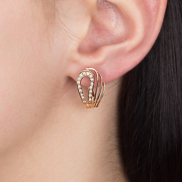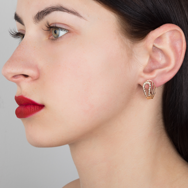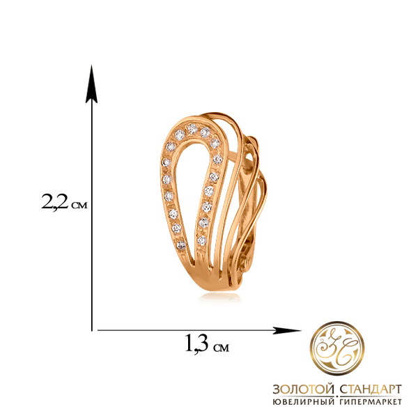 Эти стильные золотые серьги прекрасно дополнят любой ваш наряд. И не важно что это будет: роскошное вечернее платье или строгий деловой костюм. Ювелирное украшение, которое вы имеете возможность видеть перед собой на фото нашего сайта, выполнено из красного золота 585 пробы. Лицевая сторона имеет интересную форму в виде декоративных волн. Кроме того на внешней части расположены мелкие сверкающие камешки циркониев круглой формы. Что касается фиксации, то застегиваются эти золотые серьги английским типом замка. А именно его принято считать самым надежным и практичным для сережек.