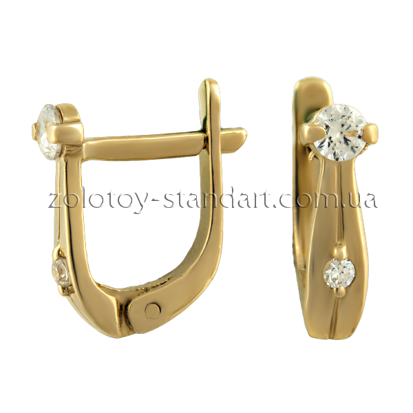 Данные золотые серьги весьма практичны. Их смело можно сочетать как с элегантным вечерним платьем, так и со строгим деловым костюмом. Ювелирное украшение, которое вы имеете возможность видеть перед собой на фото нашего сайта, изготовлено из красного золота 585 пробы. Надо сказать, что на лицевой стороне расположено несколько сверкающих камней циркония. Особенно хорошо, это изделие будет смотреться на своей обладательнице в вечернее время суток, когда цирконии будут невероятно сверкать. Но днем данные сережки будут смотреться не менее притягательно. Что касается фиксации, то застегиваются эти золотые серьги на английский тип замка.