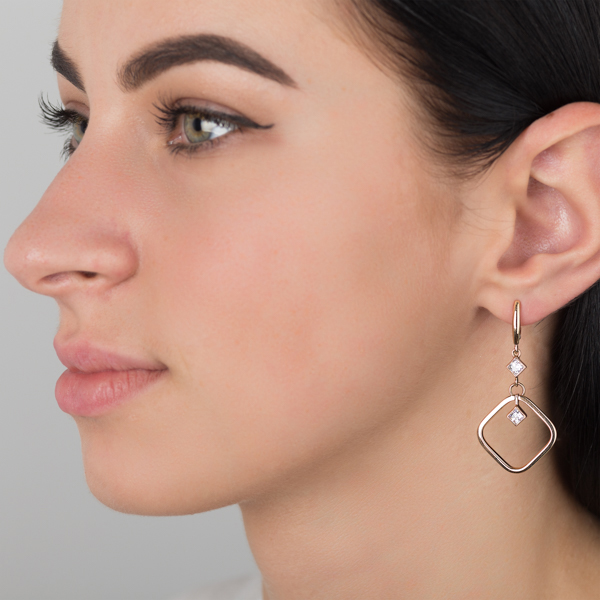 Тонкость, изящество, легкость, женственность подразумеваем мы под словом «грация». Эти серьги с одноименным названием полностью отражают в себе эти качества. В них удачно обыграна форма: полый, с мягко закругленными углами квадрат украшают две миниатюрные, тех же очертаний вставки с драгоценным прозрачным самоцветом – цирконием. В результате украшение смотрится очень стильно и необычно.