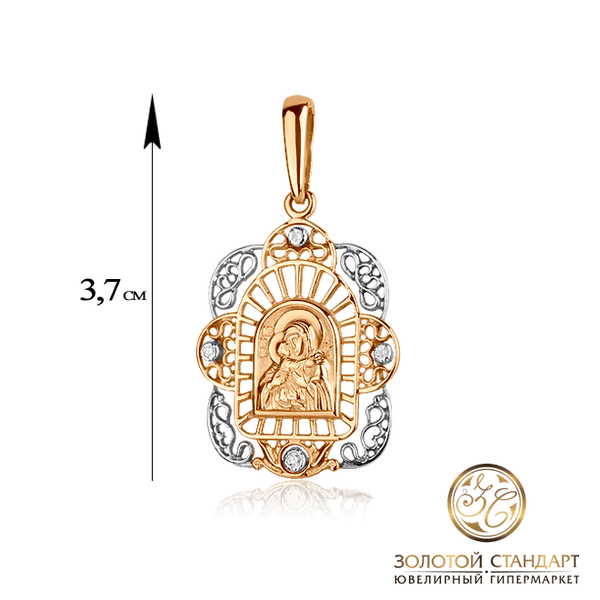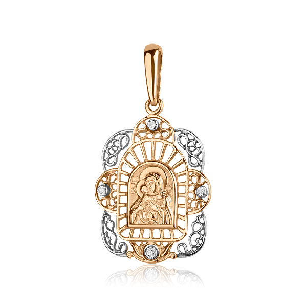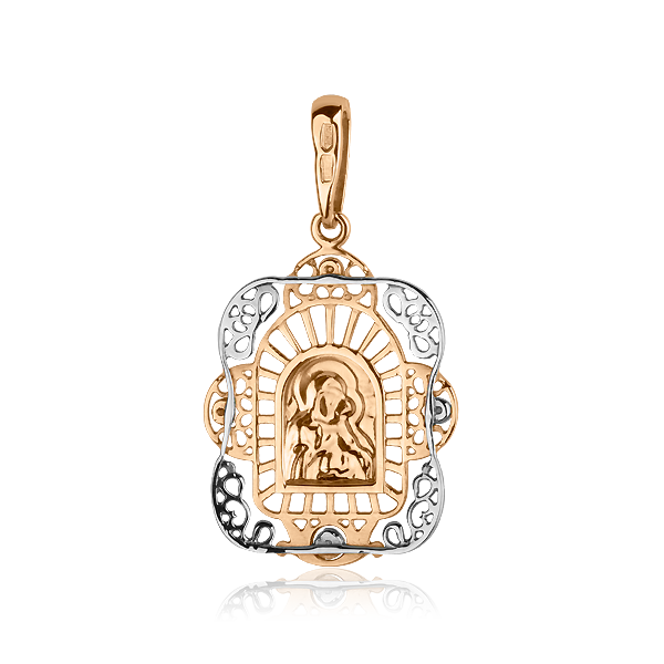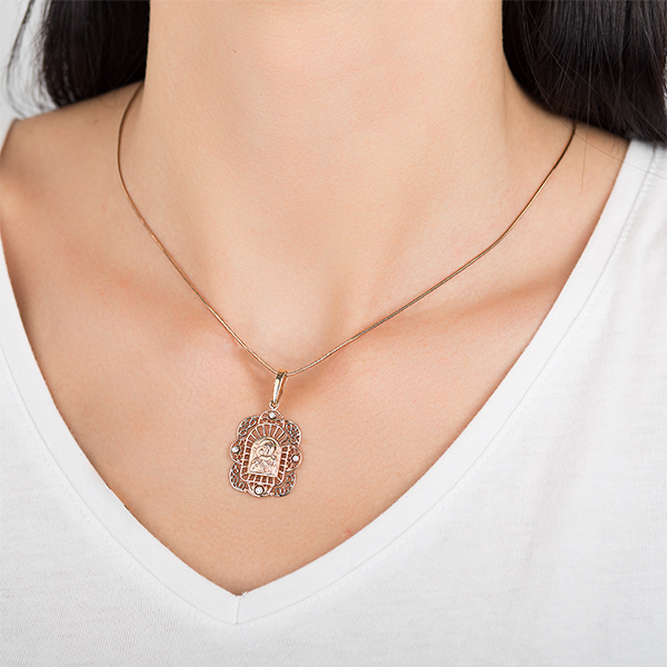 Религиозная тематика в ювелирном деле известна давно. Но нужно иметь особенный дар ювелира, чтобы воплотить всю сокровенность и таинственность божественной сущности в украшение, которое в результате становится оберегом для его обладателя. Представляем Вашему вниманию золотой кулон Матери Божьей. С какой деликатностью подошли создатели этого подвеса к его изготовлению. Выполнив изображение Матери Божьей с сыном на руках из 585 пробы, они сначала обрамили его в лучевую кантовку из красного золота, а потом, обнесли его узорчатой, нежной каемкой из белого и красного золота. Как бы создавая двойную защиту. Цирконии в качестве вставок, излучающие свет по четырем краям подвеса, придают ему благовидность и чистоту. Наверное, именно поэтому это изделие воплотило в себе, как красоту изящного украшения, так и божественную силу ежедневного амулета.