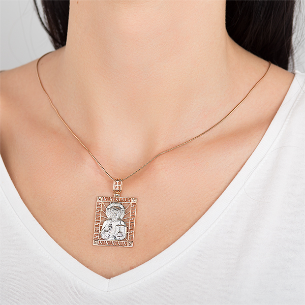 Ладанка-иконка Святого Николая Чудотворца в ажурном обрамлении выполнена из белого и красного золота 585 пробы. Ее хорошо носить на цепочке как оберег. Ее также кладут под подушку детям или подвешивают золотой образок над детской кроваткой – чтобы отводил его обладателя от всего дурного. Это изящное украшение можно дарить уже освященным с любовью и верой во все светлое. Ведь недаром в народе говорили: «Никола – второй после бога заступник». Такая ладанка может быть прекрасным подарком для ребенка. Или для кого-то из друзей. Известно, что святой Николай Угодник покровительствует не только детям, но и торговым людям и морякам.