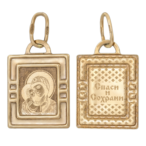 Невероятно красивая, изысканная и утонченная – она сама элегантность, сама аккуратность, сама эффектность. Эта иконка выполнена из красного золота 585 пробы и имеет неимоверно креативное и нестандартное оформление краев – они словно обложка книжки заставляют нашу фантазию бурлить и представлять перед собой то ли новое издание Библии, то ли древнее Евангелие. На лицевой стороне представлена нам сама Богородица с сыном Иисусом на руках, на обратной же – столь загадочная и сокровенная надпись «Спаси и Сохрани», которую окружают равномерно распределенные по всему периметру маленькие крестики – знаки веры. Скорее становитесь обладателем столь необычной золотой иконки и гордо носите ее на своей шее.