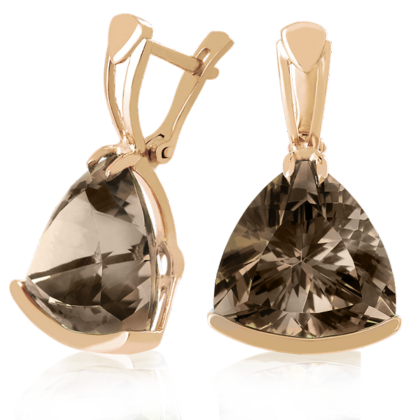 Огни вечернего города – именно эта ассоциация приходит в голову, лишь взглянув на такие волшебные серьги. Два крупных раухтопаза, вплетенных в кружево из универсального красного золота 585 пробы, создают эффект элегантности, изысканности. Мерцание, окрас двух треугольников мистического камня представленных золотых серег можно сравнить разве что с манящим ароматом утреннего кофе или со соблазнительным вкусом горького шоколада. От магии, создаваемой драгоценностью, замирает сердце любой дамы независимо от возраста или предпочтений в стилях. А надежный английский замок еще больше стимулирует купить серьги именно такого дизайна.