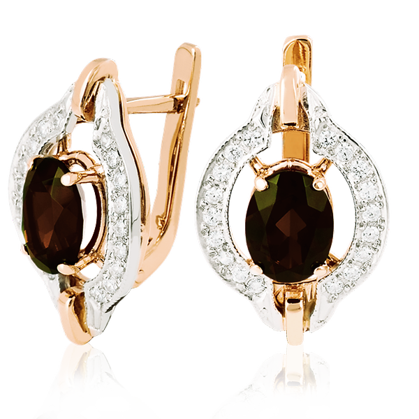 Сегодня стать королевой не составляет особого труда – можно просто купить серьги, которые Вы сейчас видите, и сиять, словно настоящая монархиня на роскошном балу. Великолепные темно-коричневые оттенки удивительного раухтопаза, который украшает это изделие в виде двух очаровательных овальных вставок, создадут элегантный и изысканный вкус всего Вашего образа. Такие фигуры окружают полоски небольших кристалликов сияющего циркония. Выполнен уникальный аксессуар из качественного красного золота 585 пробы. Тип замка на изделии – английский, что является надежным залогом долгой службы золотых серег.
