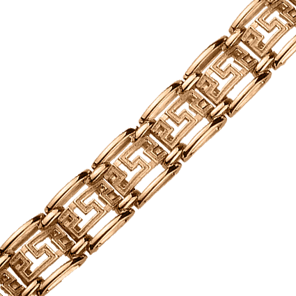 Стильный золотой браслет из красного золота 585 пробы, который, не смотря на отсутствие вставок, имеет роскошный, нарядный внешний вид. Красное золото обладает неповторимым блеском и насыщенным цветом. Узор браслета имеет египетские мотивы, что придает ему некой загадочности. Тип плетения называется Ролекс, поэтому Вы заметите, как выгодно отличается данное украшение от многих других. Тип замка — коробчатый, прост и удобен в использовании.