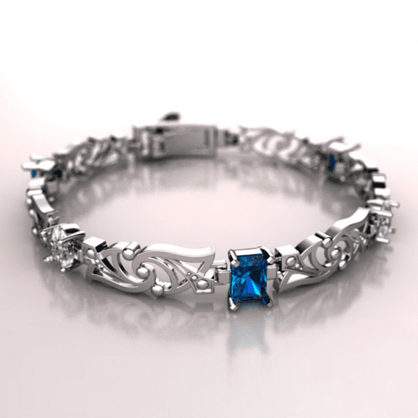Красивый жесткий браслет, где фигурные элементы чередуются с большими драгоценными камнями прямоугольной и круглой формы. Дизайн звеньев состоит из плавных линий, стилизованных под листики, с вкраплениями маленьких «капелек росы», выполненных из золота белого цвета. Завуалированная застежка, практически незаметная с внешней стороны, размыкает браслет. Это украшение выглядит основательно, дорого и презентабельно. Поэтому подойдет дамам среднего и старшего возраста. Этот браслет – прекрасный подарок ко дню рождения, юбилею, памятной дате, празднованию годовщины свадьбы.