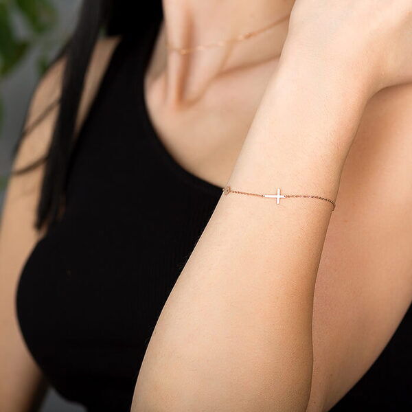 Тонкий золотой браслет на руку с якорным плетением. Украшение смотрится на руке изящно, легко и в тоже время привлекает внимание оригинальной подвеской. Тонкий крестик из красного золота 585 пробы гармонично соединен с цепочкой, подчеркивая тонкое запястье и делая акцент на движениях Ваших рук. Браслет застегивается при помощи шпрингельного замка, который подходит к дизайну украшения.