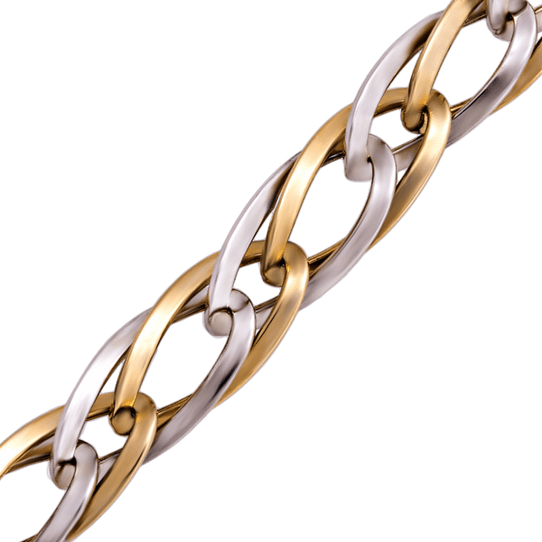 Браслет всегда будет незаменимым предметом, если его правильно преподнести. Украшение которое привлекло ваше внимание и несомненно понравится и всем окружающим. Простота и гармония двух металлов – так можно охарактеризовать данное ювелирное изделие. Большие кольца в плетении, подчеркнуть женственность нежность дамы, которая будет его носить.