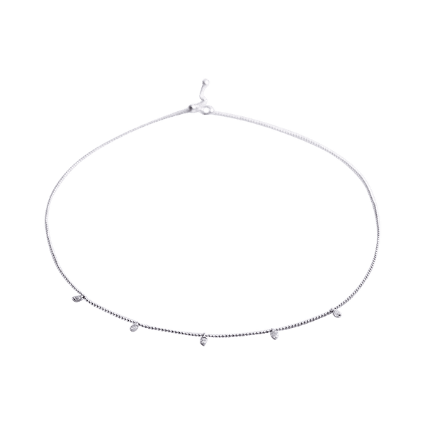 Невесомая цепочка якорного плетения изготовлена из высокой 750 пробы белого золота. Пять небольших подвесок в форме капли содержат вставки из белых бриллиантов. Изделие закрепляется функциональной застежкой – шпрингельным замком. Колье будет уместным как для офисного, так и для изысканного вечернего стиля.