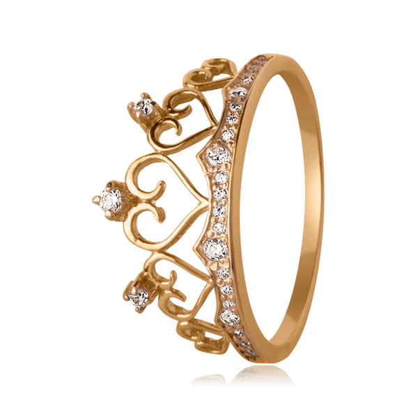 Стильное и модное кольцо в виде короны, надев которое, Вы всегда будете чувствовать себя принцессой. Данная форма получила распространение совсем недавно, но несомненно, является очень знаменитой. Кольцо в виде короны станет чудесным подарком для любой представительницы прекрасного пола. Выполненное из красного золота 585 пробы, украшенное по периметру фианитами, данное кольцо притягивает взгляды окружающих. Лицевая часть украшения, представлена в виде сердечек, которые покрывает россыпь камней, чудесно сверкающих в лучах солнца. Такой аксессуар внесет толику игривости и очаровательности в Ваш образ.