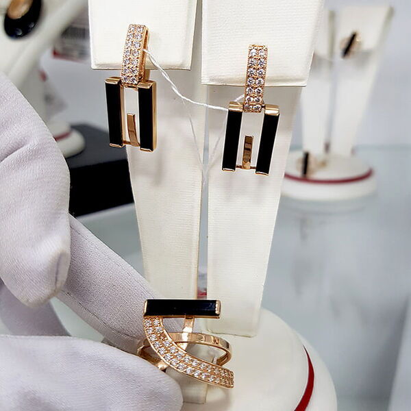Представленное ювелирное украшение изготовлено из красного золота 585 пробы. Кольцо украшено вставкой из черного агата и декорировано яркими фианитами. Золотое кольцо выполнено в популярном геометрическом стиле и прекрасно дополнит любой женский образ. К кольцу также можно подобрать комплект из оригинальных золотых сережек с агатом и фианитами.