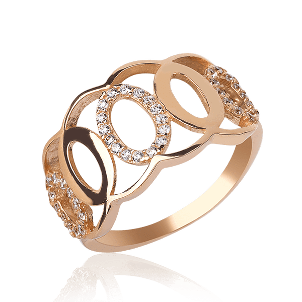 Стильный аксессуар изготовлен из золота 585 пробы красного оттенка. Композиция имеет вид утонченных закругленных узоров, которые создают оригинальный дизайн шинки. Дополнено изящное кольцо маленькими фианитами, блеск которых подчеркивает цвет благородного металла и элегантность изделия. Ювелирное украшение станет идеальным дополнением к повседневному или деловому стилю.