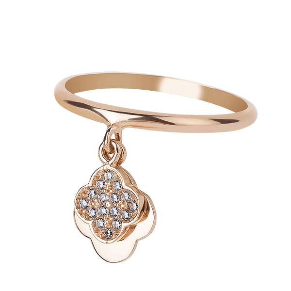 Стильное кольцо создано из красного золота 585 пробы. Тонкий ободок ювелирного украшения дополнен утонченной подвеской в виде клевера. Инкрустирован аксессуар мелкими искристыми фианитами, блеск которых идеально сочетается с дизайном украшения. Такое изделие станет отличным дополнением к повседневному и деловому наряду, выражая чувство вкуса каждой женщины.