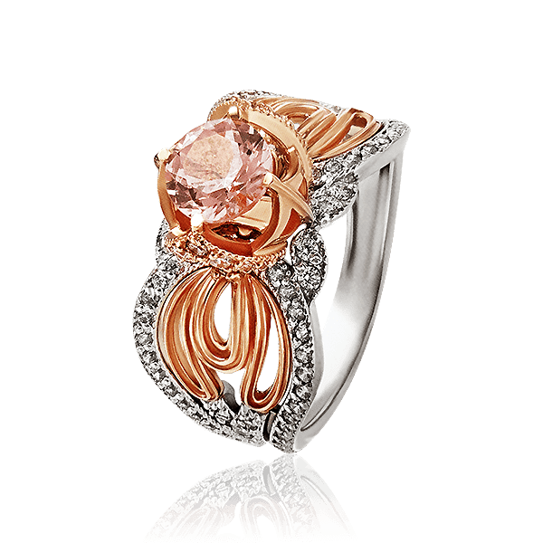 Это кольцо заслуживает особого повода и выхода, поэтому оно займет достойное место в коллекции Ваших золотых украшений. Широкий ободок из белого золота 585 пробы состоит из белых фианитов и фигурных линий из красного золота. На верхушке кольца ярко сияет розовый морганит круглой огранки. Его удерживают четыре тонкие лапки, которые, словно корона, имеют бесподобный королевский вид.