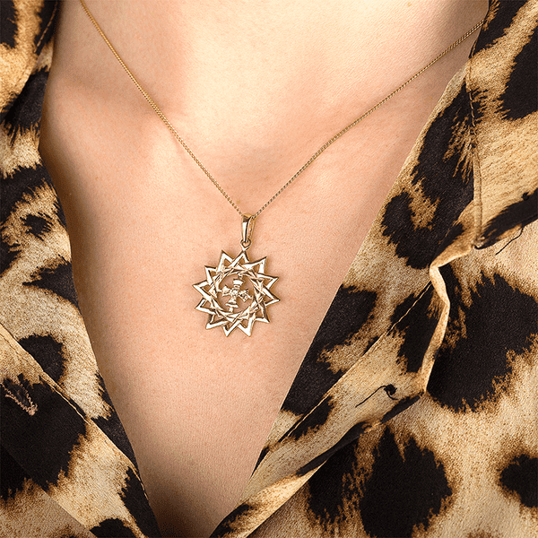 Золотой кулон в виде Звезды Эрцгаммы – мощный амулет, который поглощает негатив, защищает и помогает осуществить самые заветные желания. Представленное украшение выполнено из красного золота и украшено небольшим, но ярким фианитом по центру изделия. Золотой кулон можно носить на цепочке или шнурке поверх одежды, так сила амулета будет проявляться на полную мощь.