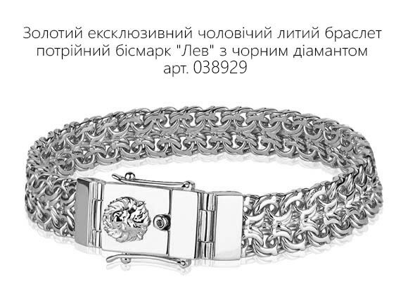 Рады видеть Вас в ювелирном магазине Zolotoy Standart. В каталоге магазина Вы можете приобрести Золотой эксклюзивный мужской литой браслет тройной бисмарк "Лев" с чёрным бриллиантом 038929 и браслеты на руку из золота с доставкой в короткий срок в Кропивницкий и по другим уголкам страны. Также на сайте представленыи другие ювелирные изделия, например - женское кольцо золотое, детские сережки золотые по лучшей стоимости. Обращаем внимание, что купить золотой крестик детский можно оставив заявку на сайте.