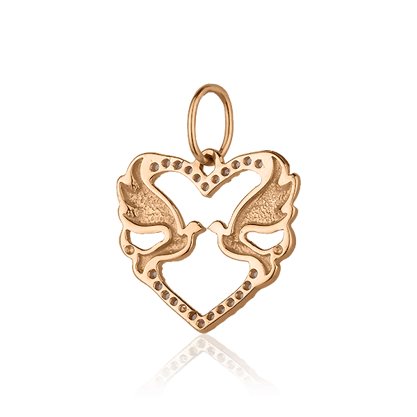 Очень красиво и романтично смотрится подвеска в виде сердца, особенно, если она имеет оригинальный и необычный дизайн, дополнен двумя голубями. Сам кулон, представлен в виде изящного сердца, изготовлен из красного золота 585 пробы. Сердце по краям полностью усыпано фианитами белого цвета. Два голуба очень красиво и гармонично расположились по краям украшения. Дополнить подвеску можно любой цепочкой.