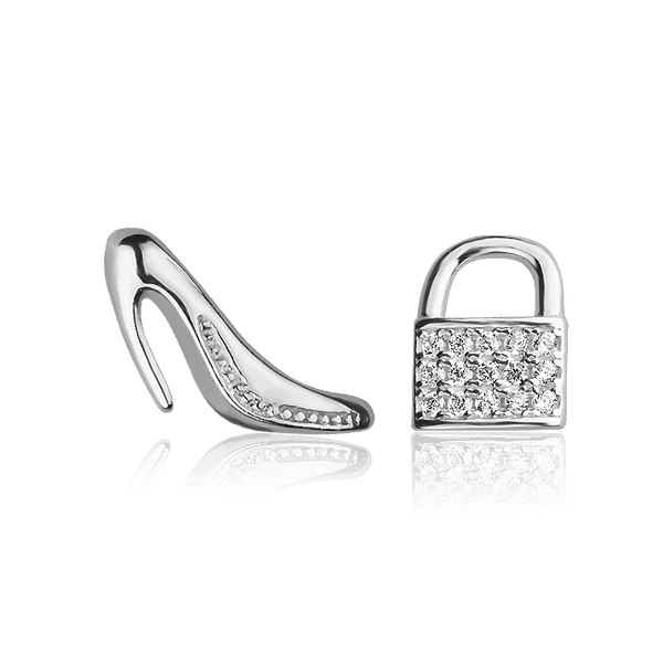 Приветствуйте оригинальность и сочетание несочетаемого! Стильные серебряные серьги-гвоздики с фианитами исполнены в виде туфельки и замка. Единственное, что объединяет украшения, – это застежка «гвоздик» и серебро 925 пробы. На первый взгляд даже может показаться, что это разные сережки, потерявшие свою «пару». Но согласно с последними модными тенденциями, абсолютно непохожие серьги в ушах – последний писк моды!