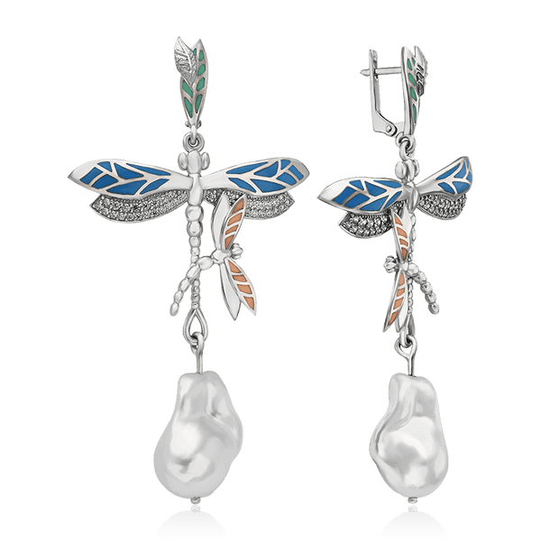Серебряные серьги с эмалью, фианитами и барочным жемчугом 034147 - уникальность в каждом выборе