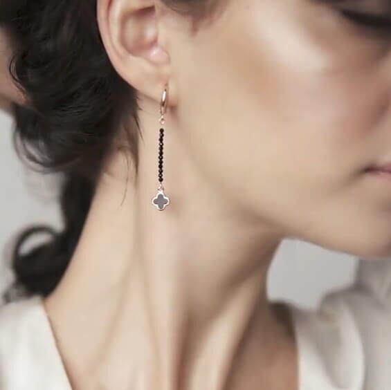 Роскошные серьги изготовлены мастерами ювелирного искусства из золота 585 пробы красного цвета. Изящные маленькие шарики из черного агата плавно стекают вниз, идеально подчеркивая красоту шеи и черты лица. Композиция выполнена в виде клевера декорирована эмалью черного цвета. Английский замок обеспечит удобное и надежное ношение ювелирного украшения. Серьги гармонично дополнят вечерний наряд.