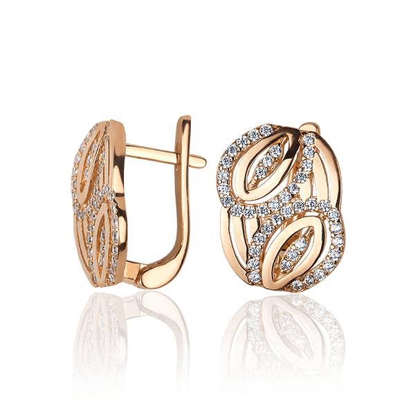 Серьги с элегантным дизайном оснащены английским замком и изготовлены из золота 585 пробы красного цвета. В центре композиции переплетаются утонченные линии, которые инкрустированы маленькими фианитами. Сочетание оттенка металла и блеска камней создает идеальный аксессуар для вечернего образа. Украшение подойдет как молодым девушкам, так и статным дамам.