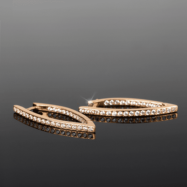 Тонкие продолговатой формы золотые серьги с фианитами. Маленькие камни расположены в виде драгоценной дорожки, которая создает невероятно эффектное сияние. Поэтому серьги смотрятся в ушах роскошно и нарядно. С их помощью Вы разбавите строгий образ, а вечерний сделаете еще более ярким и сверкающим. Серьги из красного золота 585 пробы застегиваются при помощи английского замка, который удобно прячется за мочкой уха.