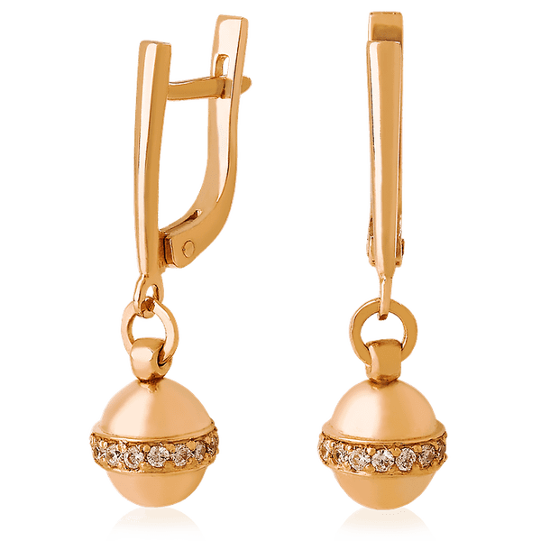 Очень изысканные, благородные золотые серьги-подвески в форме сфер. Маленькие сферы украшены белоснежным цирконием, которые придают изделию нежный, аристократический образ. Эти серьги станут прекрасным выбором, как для молодой девушки, так и для уверенной, эффектной женщины. Обратите внимание на тонкую ювелирную работу мастера, которая сделала украшение необычайно хрупким и привлекательным. Красное золото 585 пробы гармонично сочетается с цветом камня, ярко отливает на солнце и обладает насыщенным богатым цветом. Эти золотые серьги с камнями подчеркнут красоту их обладательницы.