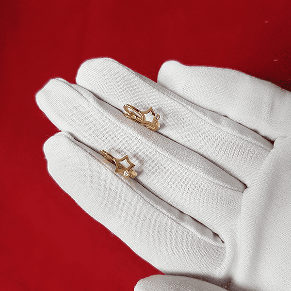Милые серьги для маленьких принцесс изготовлены из золота 585 пробы красного оттенка. Аксессуар оснащен английским замком, который является самым комфортным в носке, а также безопасным для детей. На шинке изделия расположена звездочка с вставкой из искристого фианита. Золотое ювелирное украшение станет отличным подарком на любой праздник малышки.
