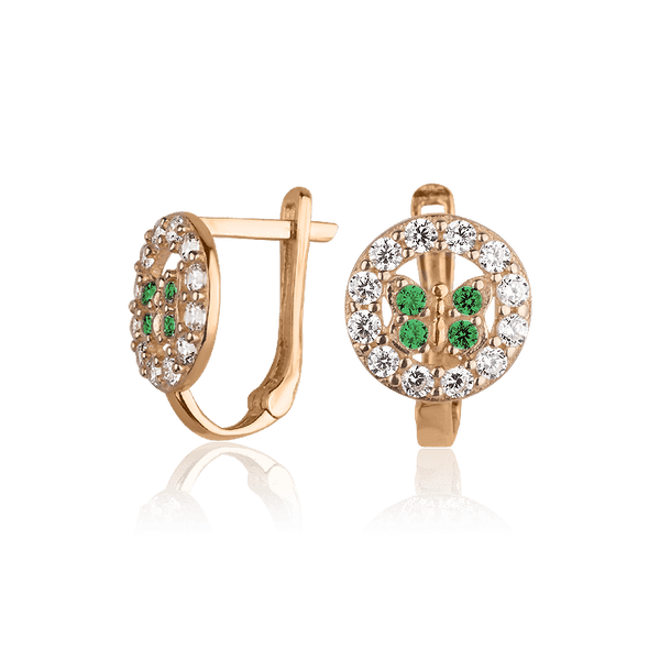 Маленькие, круглые серьги из красного золота 585 пробы с яркими зелеными фианитами. Эти серьги удобно носить хоть каждый день, так как они комфортно держатся в мочке уха при помощи английского замка, а их малый вес не вызывает тяжести в конце дня. Круглый контур серег выложен белыми кристаллами, в то время как зеленый камень образует узор в форме бабочки. Это отличный подарок для девочки подростка, которая проявляет интерес к ювелирным украшениям.