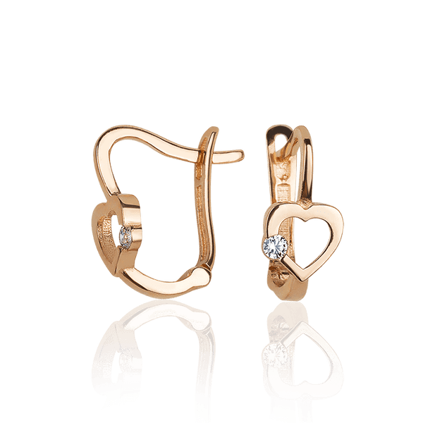 Серьги с милым дизайном и удобным английским замком созданы мастерами-ювелирами из золота красного цвета 585 пробы. Композиция имеет вид маленького сердечка с драгоценной вставкой из фианита. Благородный металл и дизайн аксессуара создают идеальные серьги для маленькой принцессы. Ювелирное изделие станет запоминающимся подарком на праздник дочери, сестры или крестницы.