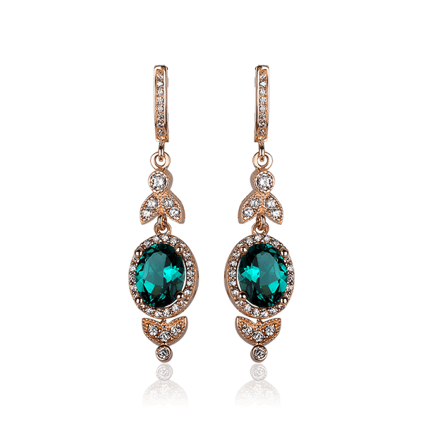 Эффектные золотые серьги с невероятной красотой халцедона помогут стать девушке главной героиней торжества. В обрамлении из красного золота 585 пробы, помещены зелёные халцедоны овальной формы, глубину которых подчёркивает сияние розсыпи из фианитов. Длинные серьги визуально вытягивают лицо, тем самым предавая образу большей элегантности.