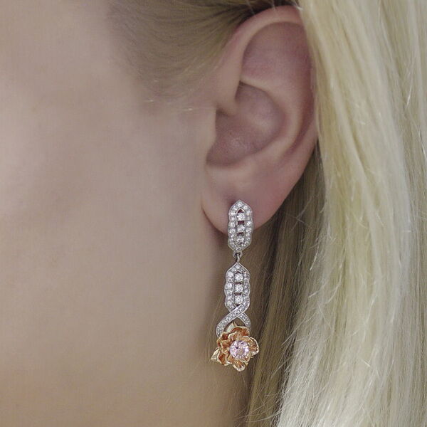 Это особое ювелирное украшение, которое прекрасно подойдет в качестве подарка на годовщину свадьбы, день рождения или если Вам предстоит романтичный вечер со своей второй половинкой. Серьги изготовлены из насыщенного красного золота 585 пробы. Подвески полностью украшены сверкающими белыми фианитами, на конце подвески покачивается морганит розового цвета. Камень оформлен в виде сердцевины цветка из белого золота 585 пробы.