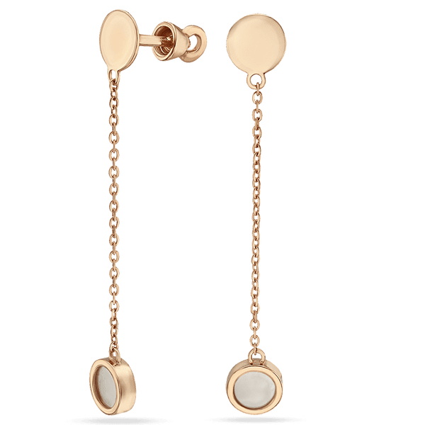 Стильные и модные длинные золотые серьги-гвоздики с оригинальным дизайном. Основа украшения изготовлена из высококачественного драгоценного металла – красного золота 585 пробы. Серьги имеют форму длинной цепочки, на конце которой разместилась небольшая круглая вставка с белым перламутром. Сверху изделие имеет лаконичную форму-гвоздика. Такие модные золотые серьги отлично впишутся в повседневный гардероб, придавая каждому образу оригинальности.