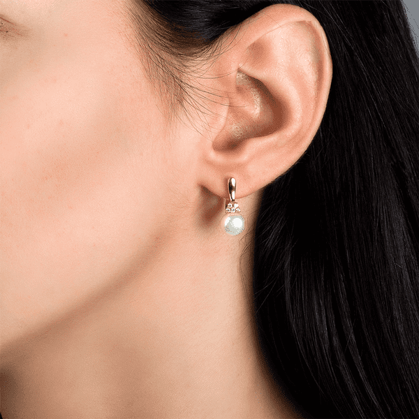 Аксессуар изготовлен из золота красного оттенка 585 пробы и оснащен удобным английским замком. Основание состоит из небольшой ставки с искристыми фианитами, под которыми расположено главное украшение сережки – крупная жемчужина. Блеск фианитов прекрасно дополняет красоту основного камня. Сережки прекрасно подойдут под романтичный или деловой образ.