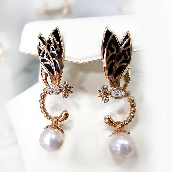 Невероятно оригинальная модель женских сережек выполнена из красного золота в форме стрекозы. Серьги декорированы черной эмалью, фианитами и жемчугом. Ювелирное украшение имеет удобную и комфортную застежку под названием английский замок. Золотые серьги Стрекоза с жемчугом эмалью и фианитами идеально дополнят стильный образ к любому событию.