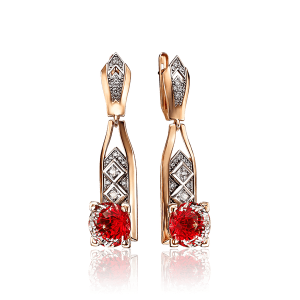 На фото представлены элегантные женские золотые серьги с горным хрусталем и фианитами. Ювелирное изделие привлекает к себе внимание благодаря яркому красному и белому золоту 585 пробы, которое было использовано при создании украшения, и дизайну. Серьги имеют удлиненную форму, украшенную небольшими белоснежными фианитами и крупным красным горным хрусталем, размещенным снизу. Застежка в аксессуаре установлена качественная и надежная – английский замок. Такие золотые серьги были созданы, чтобы украшать роскошные вечерние наряды, а дополнить образ можно золотым кольцом в таком же дизайне, которое можно купить в комплекте на сайте.