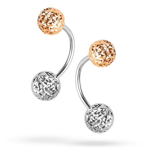 Стильные серьги созданы из сочетания золота 585 пробы красного и белого оттенков. Декоративная часть ювелирного изделия представлена двумя идеальными шариками с алмазной гранью. Несмотря на то, что отсутствуют вставки, благодаря утончённым линиям благородного металла и его контрасту, аксессуар выглядит роскошно. Данные серьги будут гармонично дополнять любой образ.